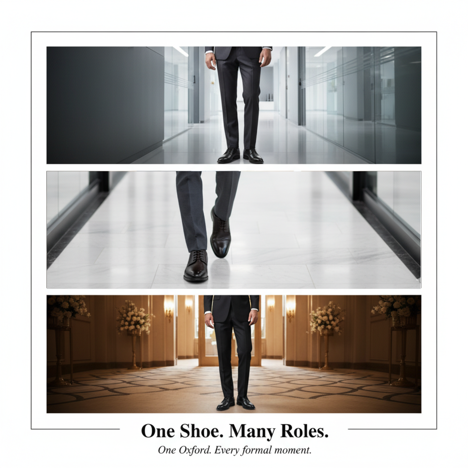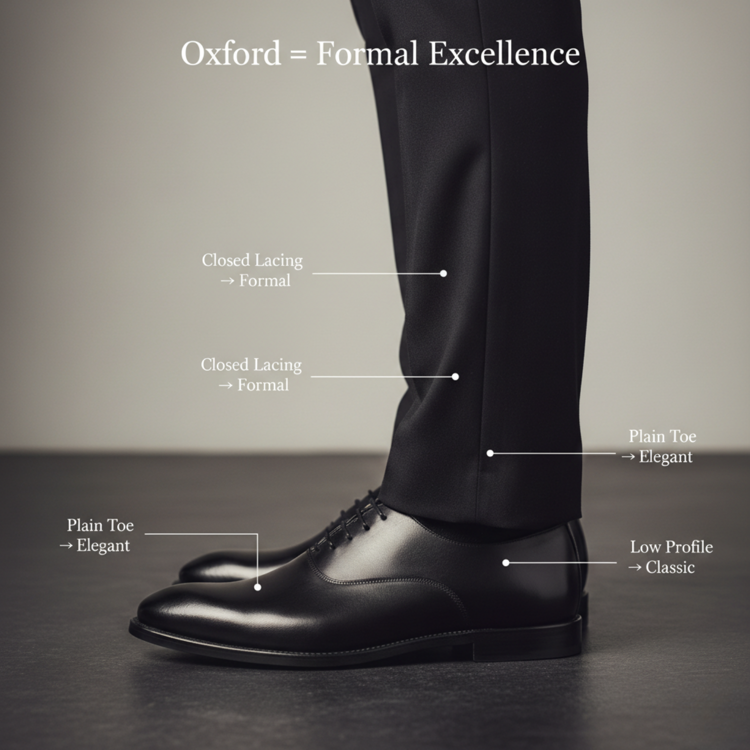 The closed lacing system (Oxford style) ensures a tight, clean fit across the vamp, delivering a structured and elite look. This construction is considered the most formal among men’s dress shoes, making it ideal for: